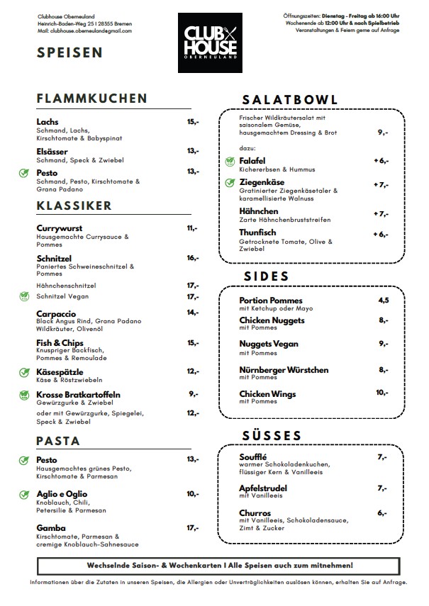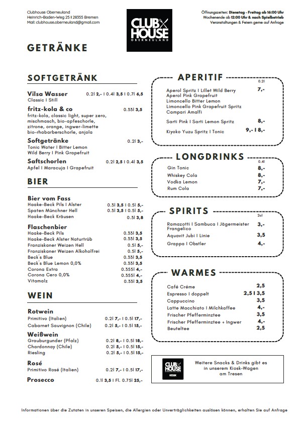 Sie erreichen uns per Mail unter clubhouse.oberneuland@gmail.com